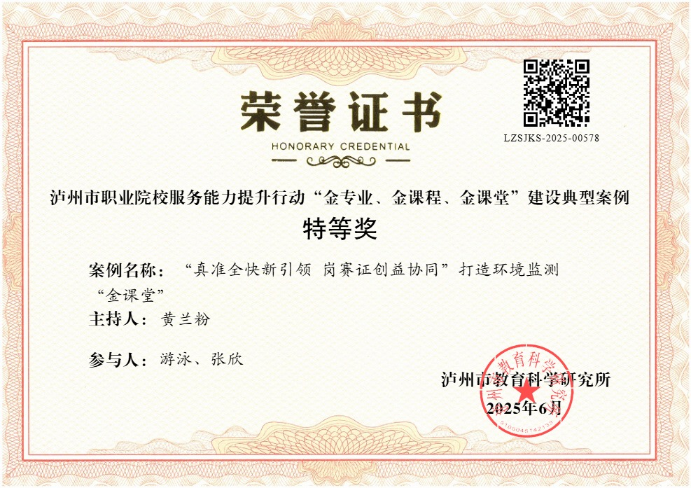 在2025年泸州市职业院校服务能力提升行动“金专业、金课程、金课堂”建设典型案例评选活动中,我院黄兰粉老师团队(张欣,游泳)参选案例《“真准全快新引领 岗赛证创益协同”打造环境监测“金课堂”》,获评“金课堂”类案例特等奖。
