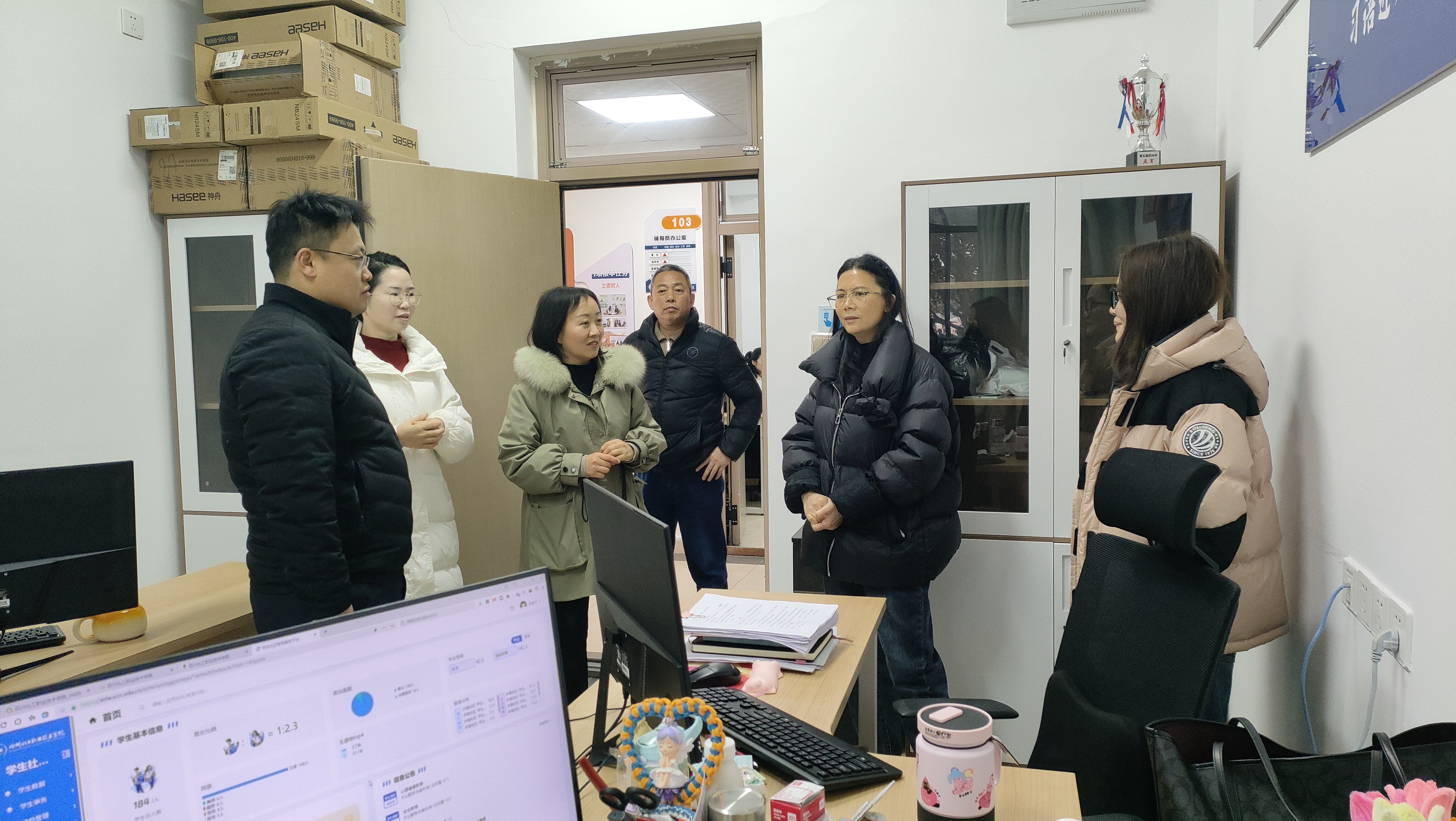 随后,领导班子来到学校“一站式”学生社区,实地查看“一站式”学生社区建设情况,并与正在社区办公的辅导员互动交流。领导班子还特别慰问了学院驻守社区的辅导员,了解其日常工作难点及办公环境改善诉求。张波书记表示:“辅导员是学生成长的引路人,学院将加强保障支持,为大家营造更高效、舒心的工作环境。”