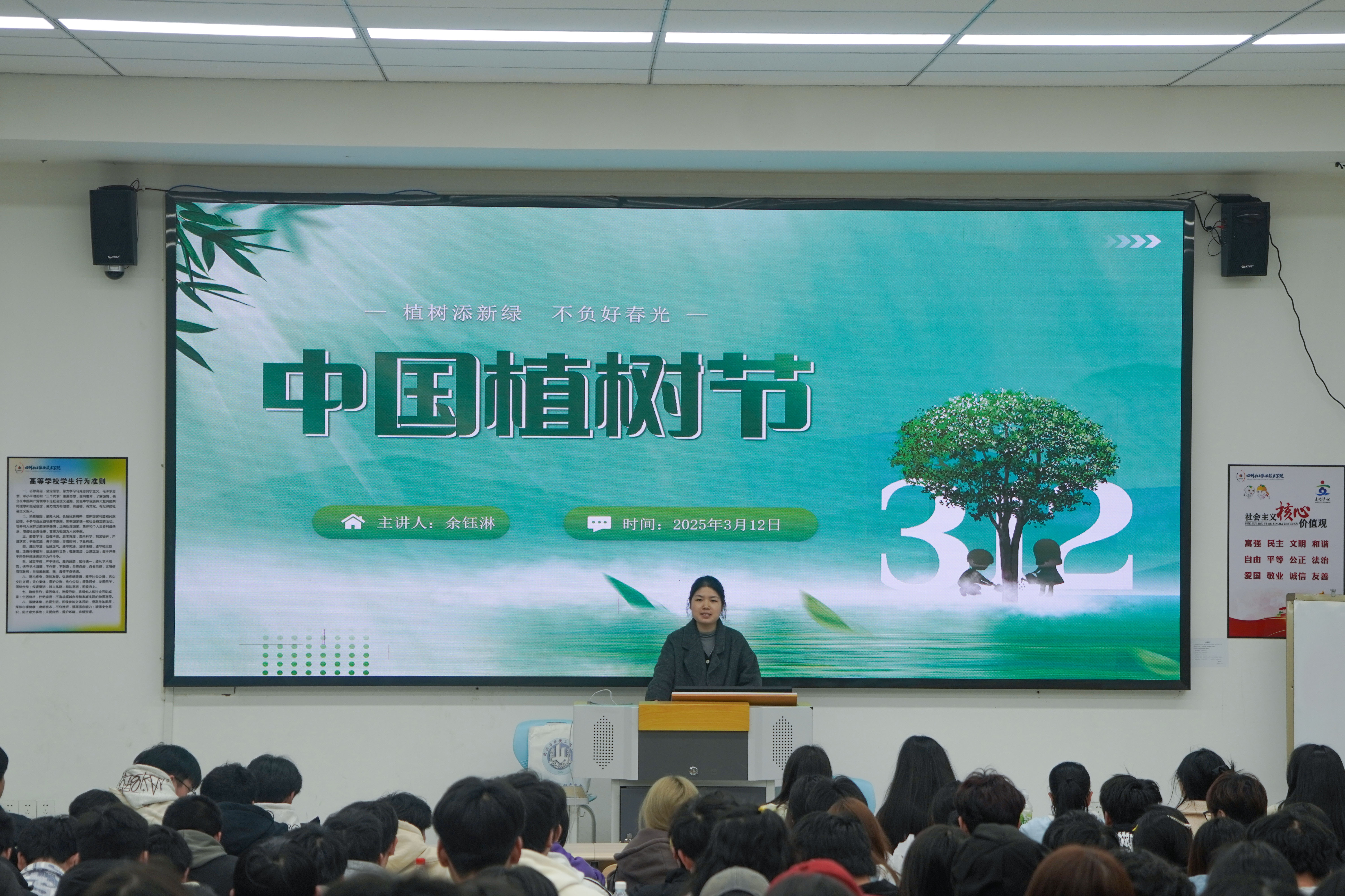 2025年3月12日,适逢我国第47个植树节,药品与环境工程学院余钰淋老师于勤学楼11A105教室为全校师生带来了一场主题为“植树节:从历史到行动”的生动讲座。活动通过知识科普与趣味互动相结合的形式,向青年学子传递生态保护理念,激发绿色实践热情。