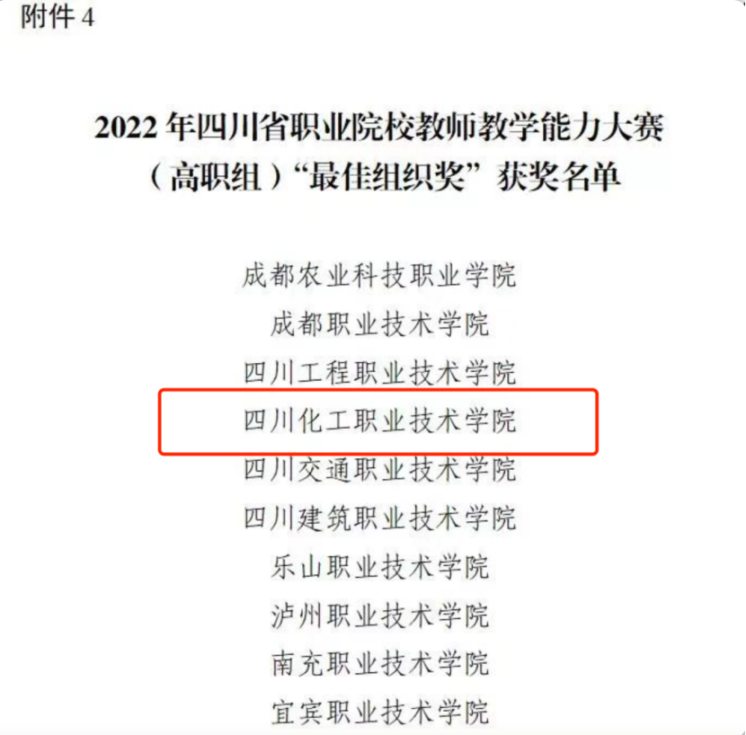 7月5日至6日,由四川省教育厅主办的2022年四川省职业院校技能大赛教学能力比赛现场决赛在德阳四川建筑职业技术学院举行。7月8日,四川省教育厅公示了2022年四川省职业院校教师教学能力大赛拟获奖名单。学校选送的参赛团队(9件作品)全部获奖,其中8件晋级四川省现场决赛。最终,学校喜获“一等奖”5个;“二等奖”3个;“三等奖”1个;学校获“最佳组织奖”,“一等奖”获奖数全省排名前三,创历史新高。