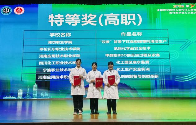 2025年第二届全国职业院校石油和化工类专业教师教学能力大赛决赛于2025年6月23日在河南应用技术职业学院圆满落下帷幕。经过网络预赛和现场决赛的激烈角逐,学院两支队伍,《化工园区废水监测》团队荣获“特等奖“,《复方丹参胶襄的制备》团队荣获“一等奖”。