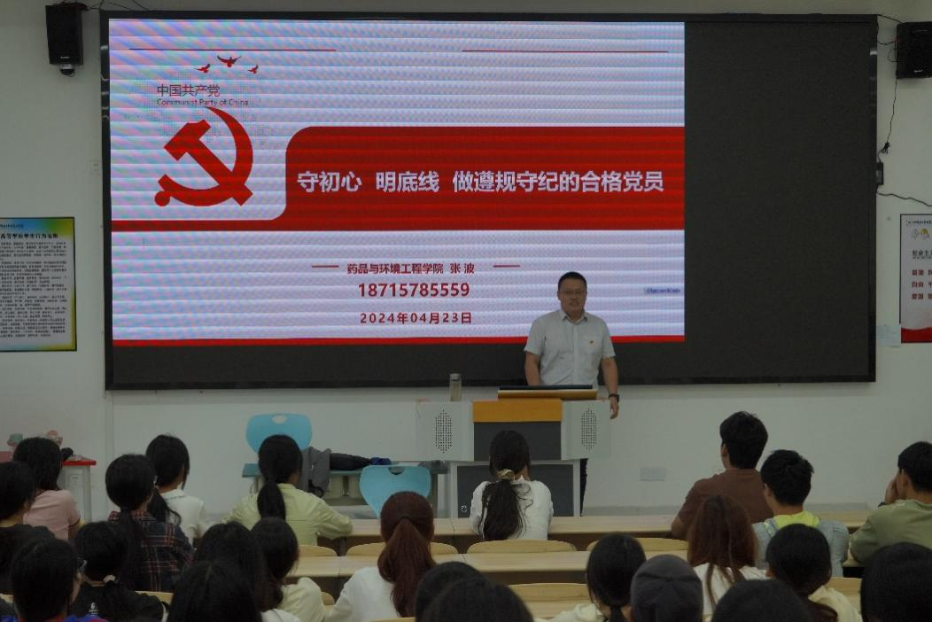 为深入学习贯彻习近平新时代中国特色社会主义思想,进一步加强党的纪律建设,引导学员们学纪、知纪、明纪、守纪,不断提高纪律意识和规矩意识,让党的纪律规矩刻印在心、外化于行。2024年4月23日下午13:00,药品与环境工程学院党总支书记张波以“守初心 明底线 做遵规守纪的合格党员”为主题在勤学楼11A105给学院全体入党积极分子讲授党课。