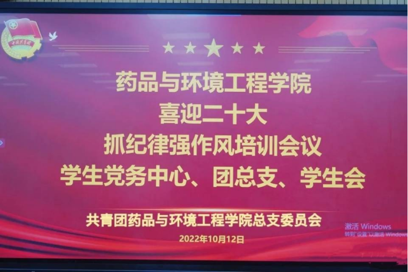 药品与环境工程学院学生党务中心、团总支、学生会,喜迎二十大!抓纪律、强作风培训会!为深学笃用习近平新时代中国特色社会主义思想,引领广大学生干部继承和发扬光荣传统,以实际行动迎接党的二十大胜利召开。共青团药品与环境工程学院总支委员会于2022年10月12日13点在8L205教室组织开展学生干部“严纪律 正作风”主题培训会。会议由药品与环境工程学院团总支书记苏双双主持,药品与环境工程学院学生党务中心、团总支、学生会各部门学生负责人、成员参会。