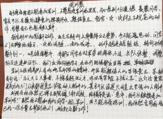 下午两点,正是训练场最热的时候。她一回到学校就到训练场报道,她说大学军训就一次,她不想错过,她要陪着同学们一起训练。她就坐在队伍的前面。认真地观摩,默默地为同学服务,写下自己的观训感。