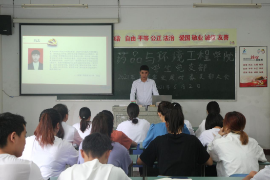 2021年6月2日14:40,药品与环境工程学院学生党支部在综合楼A区503教室召开2021年上半年发展对象发展大会,此次参加会议的有学生党支部宣传委员杨梅,冯志等21名发展对象及发展对象介绍人老师,会议由学生党支部书记苏双双同志主持。