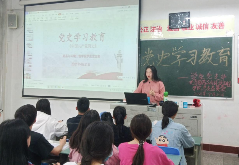 2021年4月21日16:30,药品与环境工程技术学院学生党支部在综合楼A区307教室召开《中国共产党简史》--“红船精神”党史学习教育会。支部书记苏双双主持会议,在校学生预备党员8人参加本次会议。
