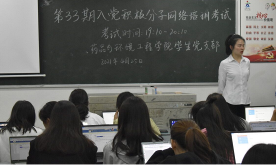 为检验入党积极分子对党理论知识的学习效果,进一步增强其对党的认知水平,2021年4月25日19:10,药品与环境工程学院学生党支部在综A501、综A503教室组织开展了第33期入党积极分子线上结业考试。本次考由学生党支部组织实施,党支部书记苏双双担任监考。