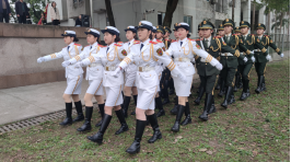国旗班的旗手们迈着整齐有力的步伐,庄严地护送国旗入场,铿锵有力的走向国旗台。主持人一声“升国旗,奏国歌,行注目礼” ,全场弥漫着一种庄严肃穆的气息。鲜艳的五星红旗冉冉升起,在化院上空中飘扬着,点燃了同学们的爱国热情。