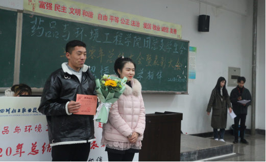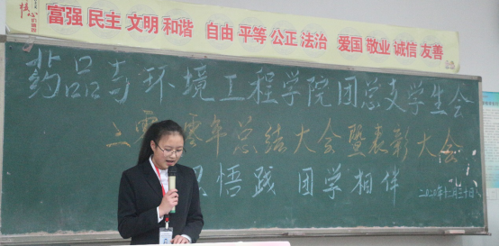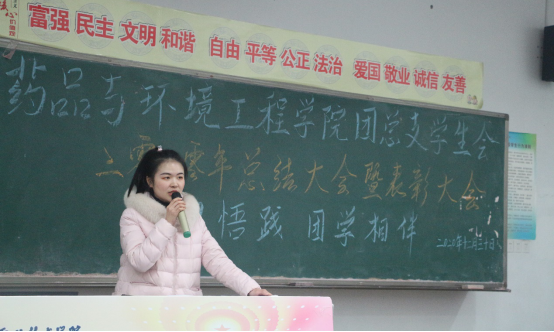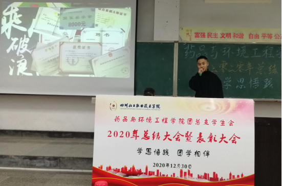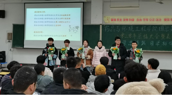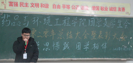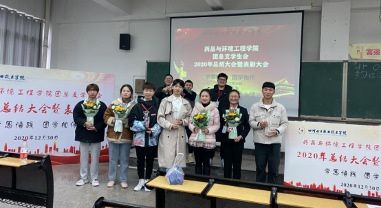 时光荏苒,如白驹过隙,稍纵即逝,辞旧迎新。为深入学习贯彻习近平新时代中国特色社会主义思想和党的十九届五中全会精神,推动我院团总支学生会长久的发展,提高团总支学生会学生干部的工作热情与质量,为树立典型,表彰先进,激励我院学生勤奋学习,积极进取,使同学们积极投身各项学习和实践,药品与环境工程学院团总支学生会于2020年12月30日15点在实训楼A区308教室开展了总结大会暨表彰大会。药品与环境工程学院团总支书记苏双双、学生会第十五届副主席艾羽、第十六届主席团、环境工程技术1831班李昊出席本次大会,大会由药品生产技术2032班邹佳璐同学、环境工程技术2031班何金猛同学主持。