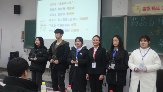 团总支副书记杨凤为2020年“最佳新人奖”获奖同学颁发奖杯。