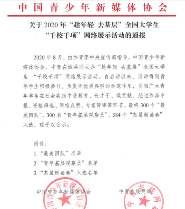 近日,“趁年轻 去基层”2020全国大学生“千校千项”网络展示活动对2020年全国大中专学校暑期社会实践中表现突出的团队予以通报表扬。该活动由共青团中央宣传部指导,中国青少年新媒体协会、中青在线共同主办。