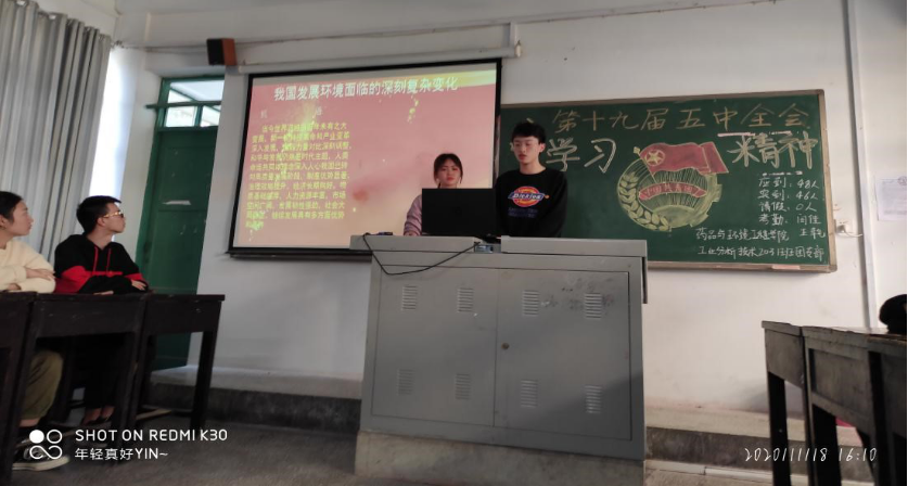 中国共产党第十九届中央委员会第五次全体会议,于2020年10月26日至29日在北京举行。为了深入学习贯彻党的十九届五中全会精神,了解党中央关于擘画发展蓝图、规划实践路径、作出的战略部署。药品与环境工程学院团总支组织部于2020年11月18日14:00-17:00组织我院19级、20级各班团支部在第一教学楼教室开展“学习贯彻党的第十九届五中全会精神”主题团组织生活。