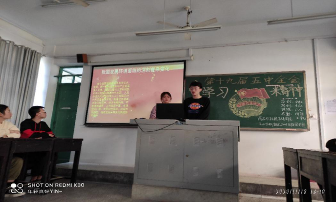 活动在嘹亮的共青团团歌中拉开序幕。我们全班同学观看了第十九届五中全会的部分会议视频和相关报道,使我们对十九届五中全会精神有了更直观的理解。杨平同学讲到:要将自己的理想和国家以及民族的发展结合在一起,为实现中华民族的伟大复兴而努力奋斗。