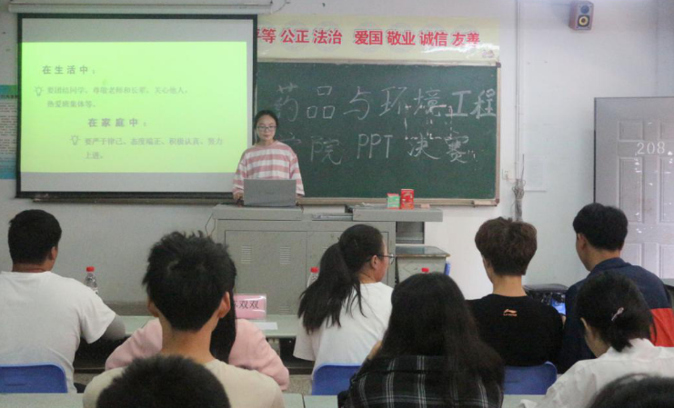 “家风正,则后代正,则源头正,则国正!”为进一步弘扬中华传统美德,培育和践行社会主义价值观,教育和引导学生养成修身律己、崇德向善的道德风尚,药品与环境工程学院团总支学生会于2020年9月18日13点在一教208开展“幸福药环,爱驻我院”家风家训PPT传承主题活动演讲比赛,参加本次比赛的评委老师是药品与环境工程学院团总支书记苏双双。