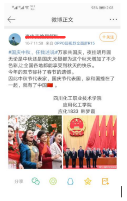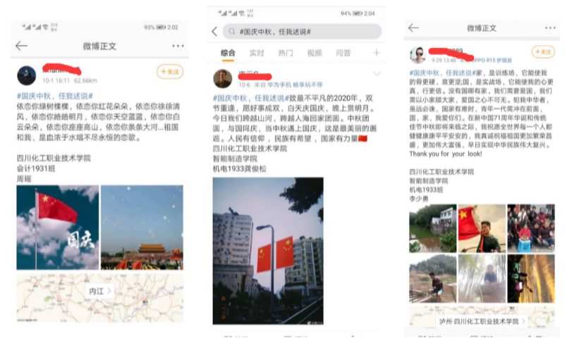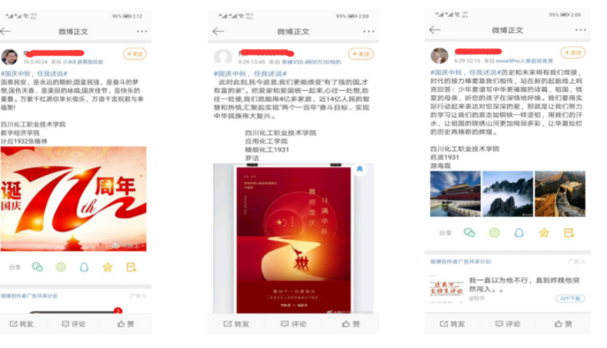十九年一次的相遇,中秋国庆“撞”在了同一天。为庆祝双节,加强学生的爱国主义教育,增强学生爱国热情,培养学生良好的爱国情操。使其紧跟党的脚步,传承党的精神。药品与环境工程学院团总支于2020年9-10月开展了“国庆中秋,任我述说:满满的党恩,殷殷的国情”微博征文活动,让同学们抒发自己的爱国情怀。