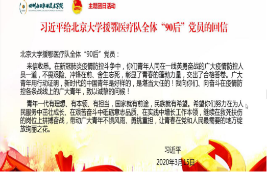 2020年3月25日16点30分,四川化工职业技术学院举行了习近平给北京大学援鄂医疗队全体“90后”党员的回信线上主题团课活动。学院党委委员、副院长文申柳、团委老师、各系团总支书及近300名青年学生党员、预备党员、团学生干部代表一同参与了本次活动。