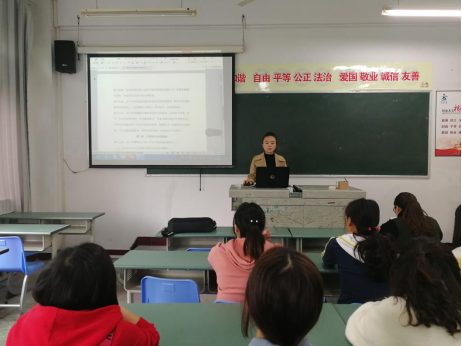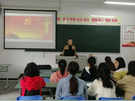 2019年4月3日14点40分,学生党支部李克嵘书记带领学生党支部纪检委员黄礼丽老师、组织委员苏双双老师和在校学生预备党员在综A503开展“《中国共产党纪律处分条例》学习月”活动。