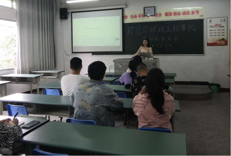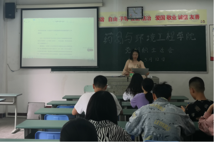 药品与环境工程学院学生党支部于2021年5月12日16点在综A503教室召开学习中共中央印发《中国共产党普通高等学校基层组织工作条例》文件党组织生活会。支部书记苏双双主持会议,宣传委员杨梅同志,在校学生预备党员8人参加本次会议。